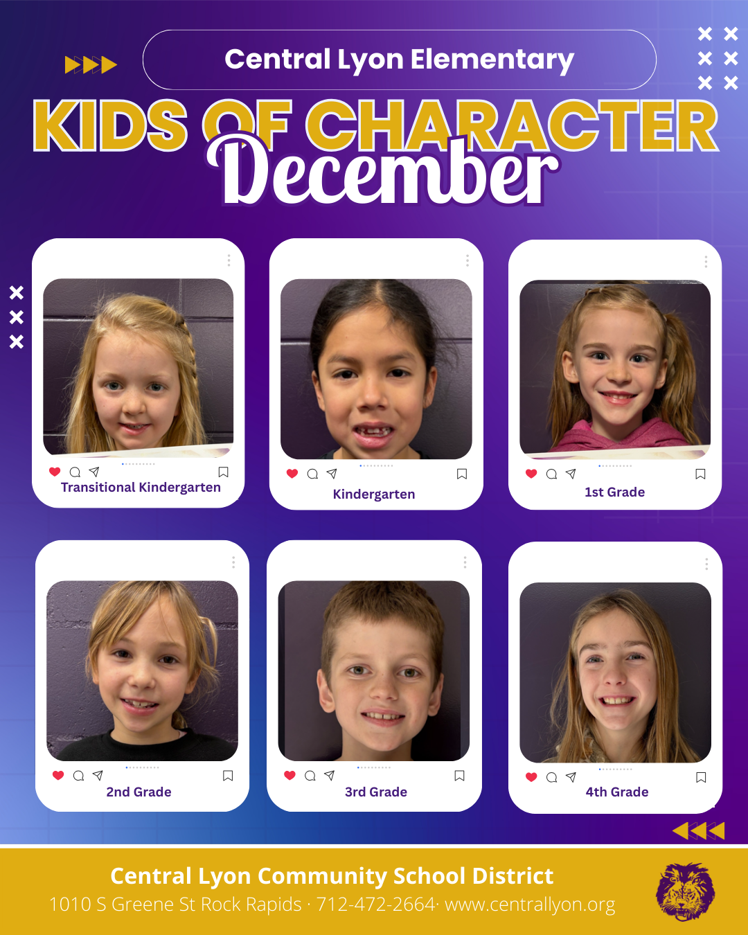 Elementary students at Central Lyon are taught that our four core expectations are to Respect All, Offer Help, Accept Responsibility, and Reach Expectations (ROAR). Staff acknowledge students following those expectations by giving them “ROAR cards” to point out what they were doing well. The cards are collected in a tote by the office. The cards are counted and six ROAR cards are drawn to recognize students who have demonstrated our Central Lyon ROAR expectations during that month. These students are known as “Lion Kids of Character” and are awarded a certificate to thank them for demonstrating our core expectations. Congratulations to these Lion Kids of Character! Way to ROAR!
